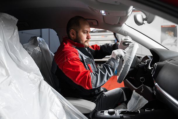 1. Накрывают салон авто защитными чехлами, чтобы не повредить покрытие.